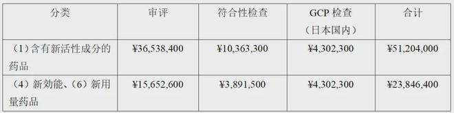 注册分类(1)的含有新活性成分的药品的注册申请时需支付的注册收费为36,538,400日元(折合人民币约179万元)(此外还需要符合性检查费用等。参考下表。)。另外,补充申请的新功效药品(注册分类(4))及新用量药品(注册分类(6))的注册收费分别为15,652,600日元(折合人民币约76.7万元)。